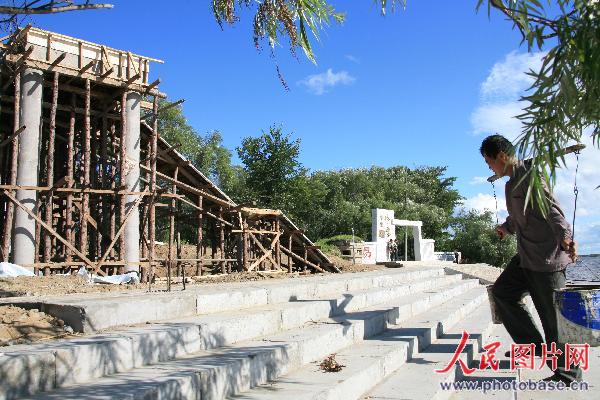 8月16日,一名建筑工人正从乌苏里江中取水搅拌风景建筑的水泥。