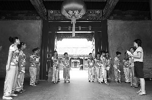 昨日(8月18日),恭王府府邸,穿着统一服装的解说员在练习解说词。恭王府府邸将于明日对外开放。记者 薛珺 摄