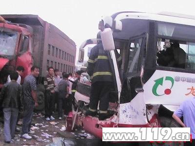 客车货车相撞多人受伤司机被困 唐山消防急救援