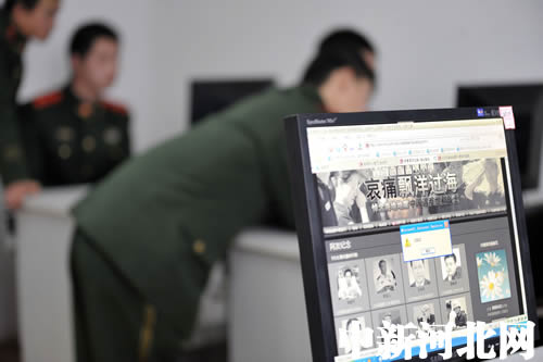 河北边防总队曹妃甸边防检查站官兵通过网络留言、敬献鲜花等形式悼念我国在海地地震中遇难的维和英雄,表达哀思。图为边检官兵通过网络向英烈献花。作者 李洪涛 崔元章