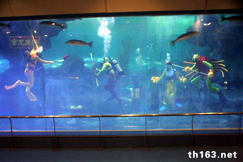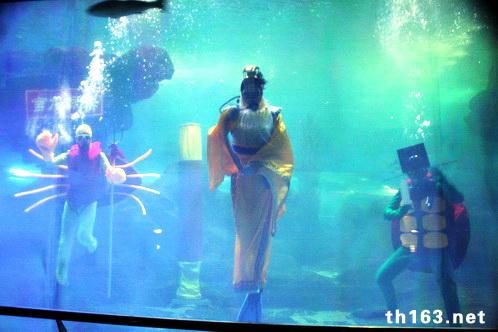 在海底世界表演大水体,点缀于其中的是水晶般晶莹的气泡和热带水草,各种鱼类...海底龙宫的变幻莫测和五彩斑斓被展现得淋漓尽致。龙王在龟宰相和蟹将的陪同下,巡视海底。
