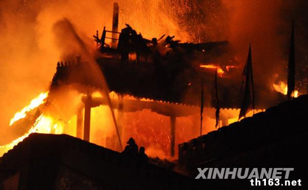 2月18日晚,消防队员奋力扑救正定古城南城门城楼大火。新华社发(韦佳摄)