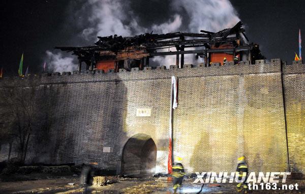 2月18日晚拍摄的火灾过后的正定古城南城门。新华社发(韦佳摄)
