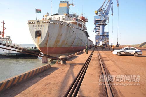 曹妃甸港通用码头外轮卸载完毕即将离港,河北边防总队曹妃甸边检站官兵在送船。
