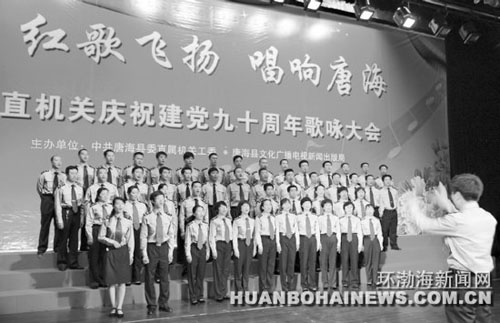 5月25日,唐海县直机关庆祝建党90周年暨“红歌飞扬,唱响唐海”歌咏大会拉开帷幕。来自县直机关的6支合唱队400余人,通过演唱《长江之歌》《歌唱祖国》等激昂奋进的经典红色歌曲向建党90周年献礼。 郑永春、王倩 摄