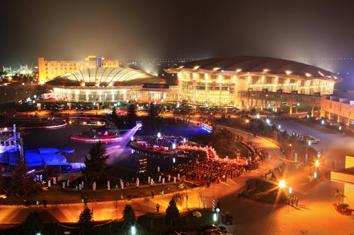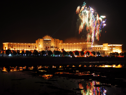 璀璨烟花下的曹妃甸论坛会址。 曹大庆 摄