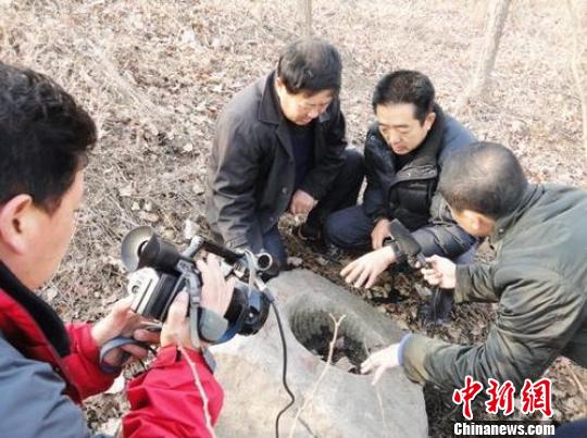 研究人员在河北唐海落潮湾对新发现的疑似契丹人遗留的石臼进行现场考察。 李连君 摄