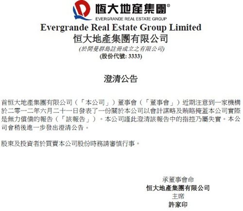 随即,恒大地产发布紧急声明,称“董事会近期注意到一家机构于二零一二年六月二十一日发表了一份关于公司以会计谋略及贿赂掩盖公司实际是无力偿债的报告。公司谨此澄清该报告中的指控乃属失实,稍后会进一步发出澄清公告。”