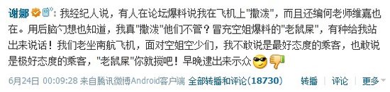 重庆商报6月26日报道(记者刘咏戈实习生张宇) 近日,有网友爆料称谢娜在飞机上当众“撒泼”,而且还当着何炅和李维嘉的面。平日嘻嘻哈哈的娜姐这次彻底被惹怒了,扬言要把这颗“老鼠屎”逮出来示众。24日凌晨,谢娜发微博称:“经纪人说,有人在一些论坛爆料说我在飞机上‘撒泼’,而且还编何老师维嘉也在。用后脑勺想也知道,我真‘撒泼’他们不管?”气愤之余娜姐不忘她的搞怪本色,声称要组织坐过航班的空姐空少们做一个名叫《娜些年我们坐过的航班》的访谈节目,反驳论坛上的恶意谣言。针对今年网上频出的恶言,谢娜和身边朋友都受到影响。谢娜还在微博中表示,“不介意大家八卦明星,但是别有计划的诽谤诬陷。”