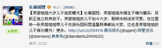 “长春国贸”称,芙蓉姐姐未婚生子为事实,而且目前正独立抚养孩子。此外,芙蓉姐姐的儿子如今六岁了,聪明伶俐,活泼可爱。