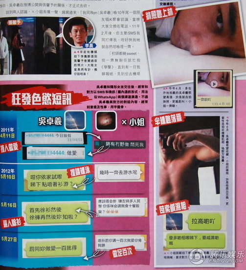 腾讯娱乐讯据香港媒体报道,近日,TVB艺人吴卓羲才被曝出遭内地女星张馨予劈腿分手,那厢又被爆料搭富家女当地下情女友,私生活糜烂。这位不愿暴露身份长相的神秘女子向八卦周刊爆料,自己与吴卓羲从10年底开始认识,之后在一起半年多,期间更是逼迫对方拍裸照、发情欲短信挑逗,男方纵欲生活暴露无遗。