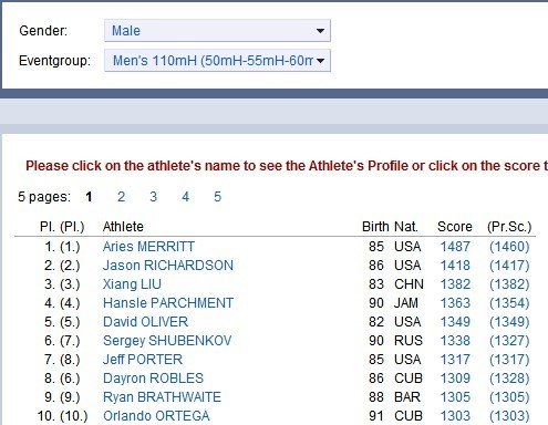 110米栏排名:刘翔第3 新纪录助梅里特稳榜首