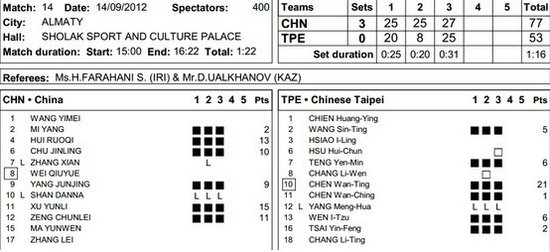 中国女排本场身高1米96的高妹徐云丽砍下15分荣膺本队得分王,惠若琪赢得13分,曾春蕾贡献11分,楚金玲斩获10分。而中华台北队陈苑婷狂砍21分。全场比赛中国队进攻得分39比37只比对手高2分,拦网得分16比3完爆对手,发球得分5比1也占据较大优势。