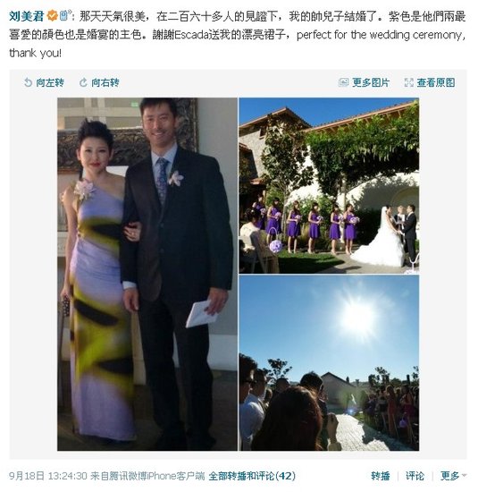 结婚的儿子是刘美君的长子,刘美君的妈妈对结婚传统习俗要求非常严格,自称“刘公子”的刘美君抱怨“皇太后”严苛:“搞得本公子跟我的宝贝儿子快疯掉了!”儿子结婚,刘美君也得到网友祝福,“恭喜新奶奶!”还有网友赞刘美君和男友超级有型,并询问“美丽的新奶奶啊,怎么样才能保养得这么好呢”。