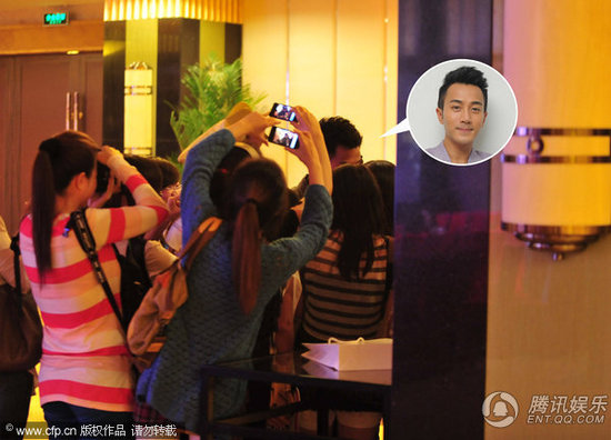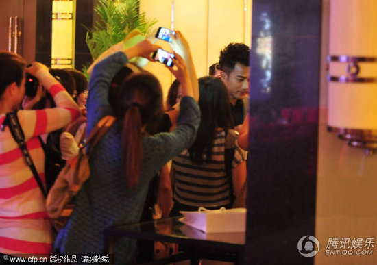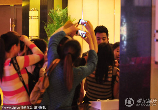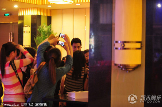 粉丝们把刘恺威团团围住索要签名,无法得到签名的粉丝只好高举相机拍摄偶像,一直把偶像护送到门口粉丝们才一一散去。