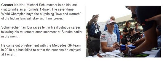 自从本月初在铃鹿宣布退役之后,舒马赫杰出的职业生涯只剩下了四场比赛。他于2010赛季在选择梅赛德斯车队复出,不过却不能复制他在法拉利的成功。而舒马赫在印度大奖赛之前明确了自己将会是永远退出这项运动:“我不想考虑未来,不过肯定不会有第二次复出了。”他周四在车队的赛道接待区这样说。