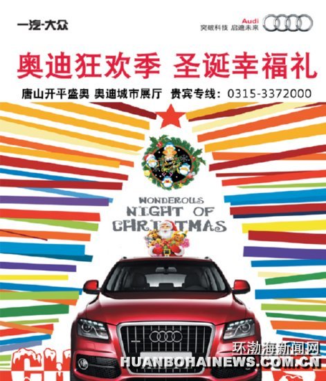奥迪狂欢季,圣诞幸福礼,12月19日至25日,唐山开平盛奥携奥迪全系感恩回馈新老客户,享年终最大现金钜惠,诚邀您莅临唐山开平盛奥奥迪城市展厅,特惠车型集体献礼,现车供应,价格风暴冲破底线:奥迪A4L最高优惠8万元,奥迪Q7最高优惠20万……活动期间购车另送万元圣诞大礼及纯正美式双人西餐,带您感受传统美式圣诞节。奥迪全系各型号强大产品阵容诚邀试驾品鉴,同期开展金融贷款、二手车置换等各项购车专案,成功置换另享万礼包。