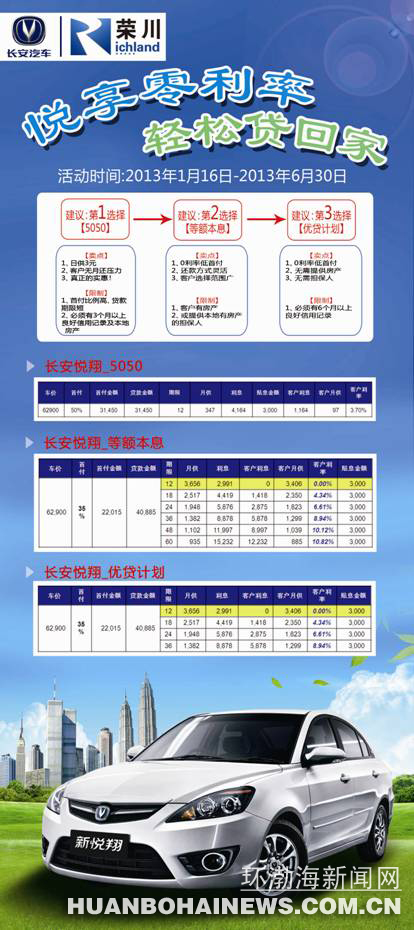 此次,针对长安悦翔2012款,“GMAC-SAIC长安贺岁款待计划”特别推出三款优惠金融方案,让您可以在低日供、低首付和0利率中,选择真正适合于您的那一款。