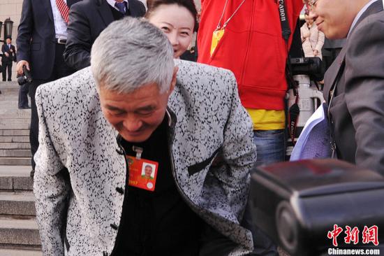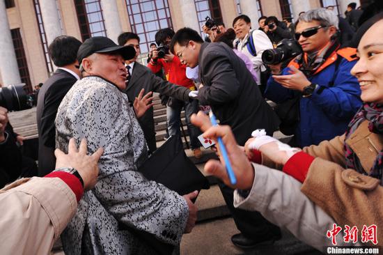 3月3日,全国政协十二届一次会议在北京人民大会堂隆重开幕。赵本山在人民大会堂前从记者群中突围,然后转身向媒体们鞠躬。中新社发贾国荣摄