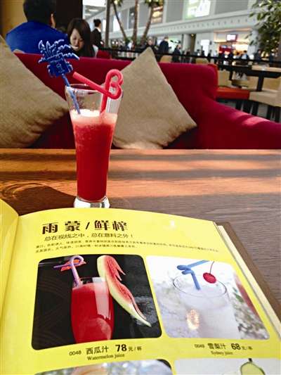 该店服务员说,店里果汁类饮料现在只有西瓜汁。记者点了一杯西瓜汁,付了78元。三四分钟