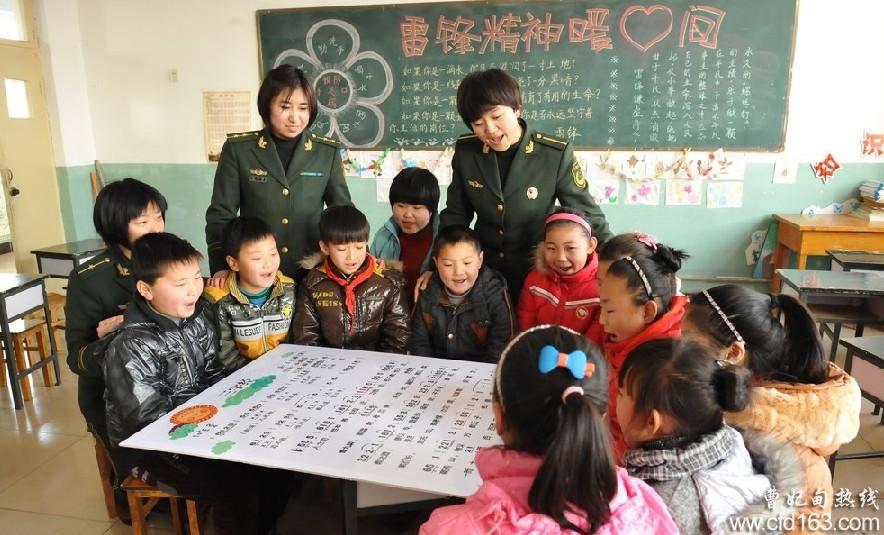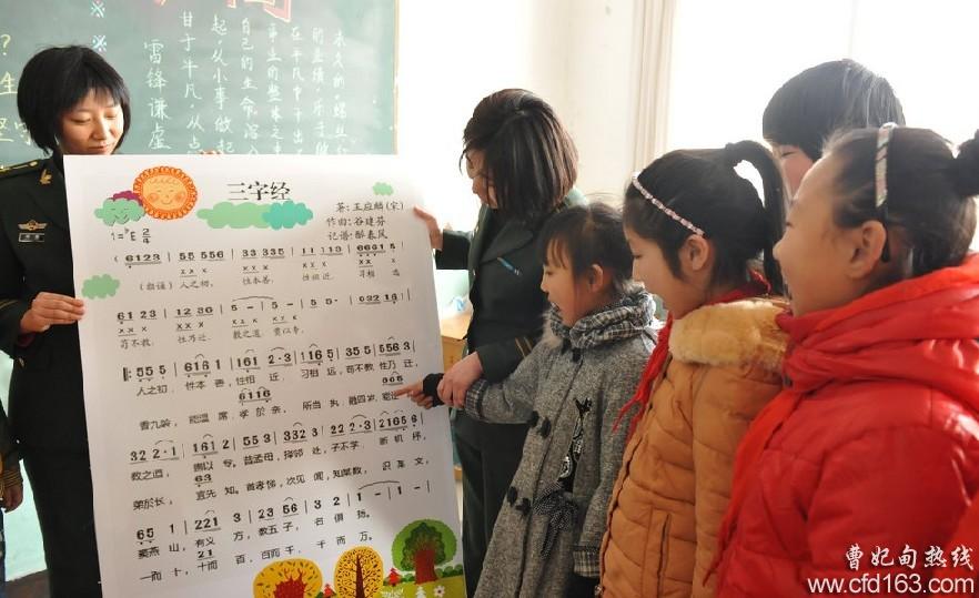 官兵们与五农场小学的孩子们围坐在一起诵读三字经。