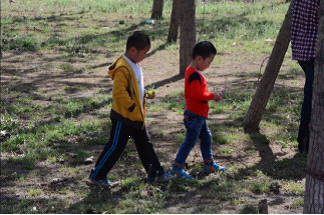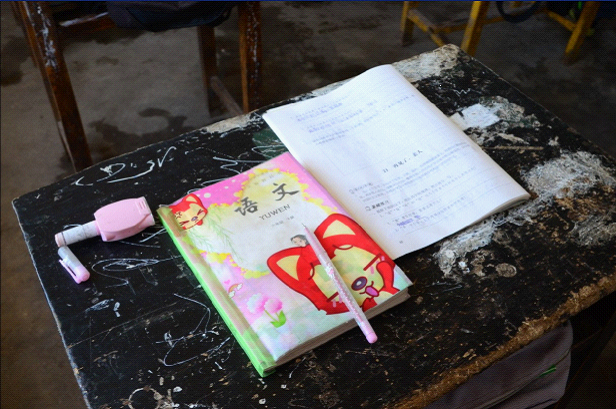 苍官营小学的教室是一间间普通平房,教室面积很小,也不过摆放30张桌椅,老式的黑板上写着计算公式,显然,这是孩子们上课痕迹。早已坑洼破旧的课桌上摆放着孩子的书本和铅笔盒,整洁的本子上有孩子们写的作业。城市的孩子很好奇地拿起一块小小的、旧旧的橡皮:“这块橡皮这么小,都用不了一个月啊!”“是啊,这里小朋友的东西比你的差多了吧?可是他们都努力地学习,所以,你也要好好学习,知道吗?”面对孩子的提问,一位家长借机教育孩子要珍惜自己的生活,好好努力。在大家参观学生的课桌上书本、作业的空档,我留意到讲台上的桌子,那是一个由破旧的长课桌改造成的讲台桌,或许是桌子泰国破旧了,被老师用白色的纸将桌面包裹了起来,上边放着粉笔盒、教学课本、现代汉语词典、老式的圆珠笔插在粉笔盒里,一个早已磨破了边儿的橙色女士挎包摆在桌子的一旁,这就是苍官营小学老师的讲台桌。而在教室的另一角,一个普通的课桌靠墙摆放,课桌上摆着一个小小的书架,书架上摆着的是十来本课外读物,原来这就是孩子们的读书角,这是我见过的最简陋的读书角了。由于校园太小,基本没有什么娱乐设施,在一个小院里,我们勉强看到了一些颜色鲜艳的滑梯、跷跷板之类,再仔细一看,院门上方写着幼儿园,这些东西是给幼儿园小朋友玩的!站在校园向北望,目光略过低矮的院墙,远处的高高矮矮的山没有一丝绿色,就这么光秃秃地成为这平地上的景色。