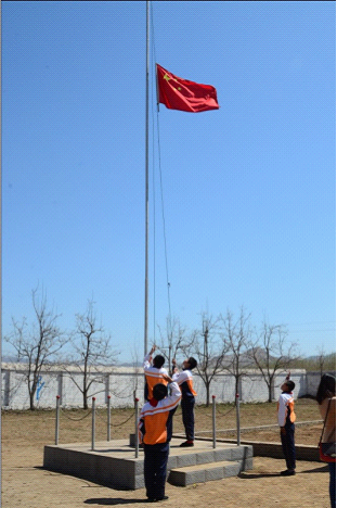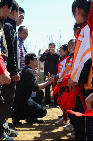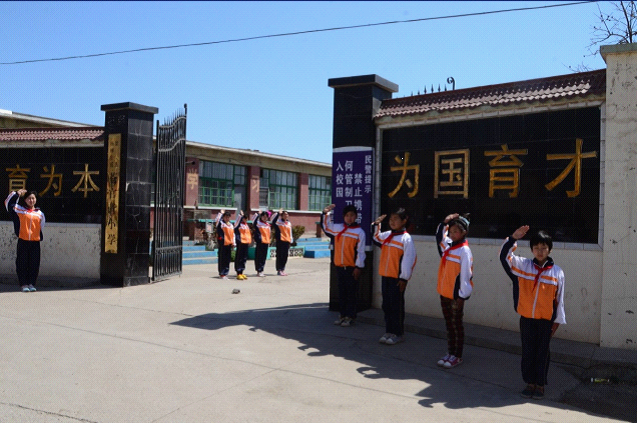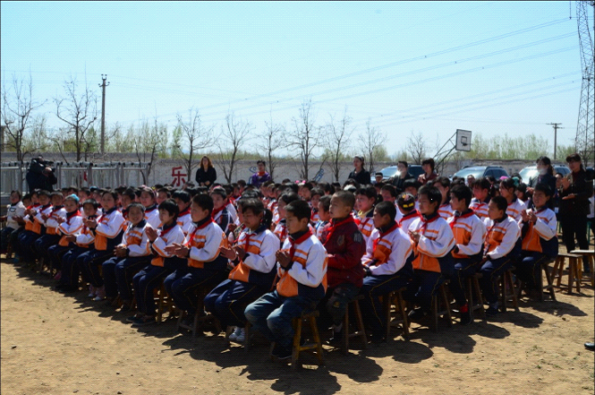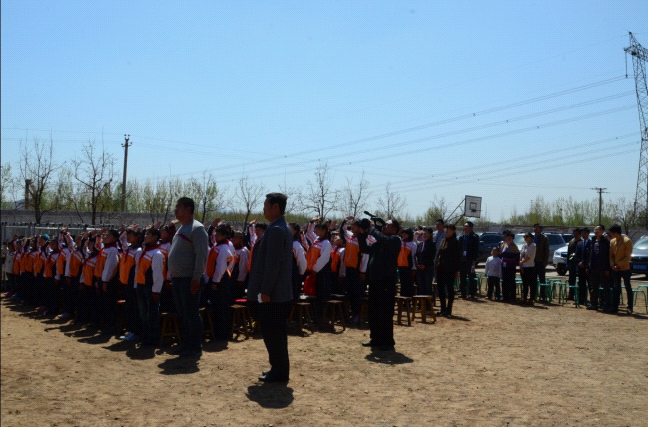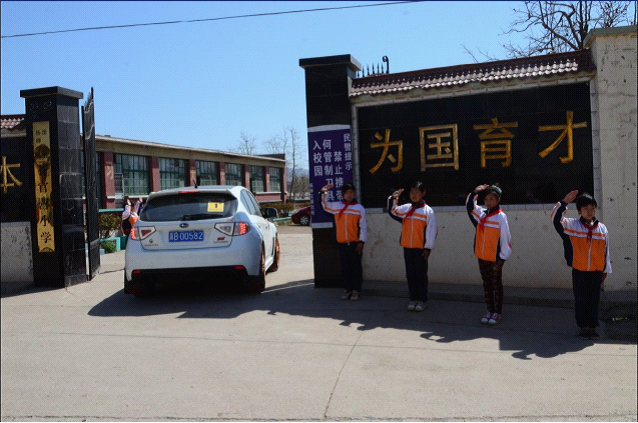 在九曲百转的乡间道路上前行,大家的心也越发激动,近了,更近了!我们看到大片平整的庄稼地,看到远处高低不一的荒山,也看到了荒山下,那所不大的院落,那就是苍官营小学了!车轮一路卷起尘土,车队向着小学进发!尽管事前想象了各种进入校园的场景,但是到达校门口的那一瞬间,大家还是震惊了、感动了。苍官营小学的学生代表穿着干净的校服,带着鲜艳的红领巾,整齐地站在校门口向叔叔阿姨们敬少先队队礼!他们的衣服并不华丽,但是他们的笑脸却那么的真诚;他们的校门并不气派,但是他们的敬礼让这个学校格外耀眼!