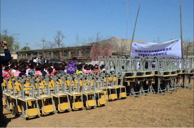 从校门到操场,也仅仅百米的距离,此次的捐赠仪式将在那里开始。而这所谓的操场,仅仅是一片平整的土地,两根竖起的木杆上绑着此次活动的背景布,几张临时从教室里搬来的桌子摆放在背景布前,这就是主席台。学校的孩子和老师们早已等候在了那里,阳光下,一张张小脸都充满了期待。由唐山斯巴鲁店捐献的70套崭新的课桌椅摆放在学生队伍的一遍,今后,孩子们将会在这崭新的课桌椅上学习、写字、画画、读书。