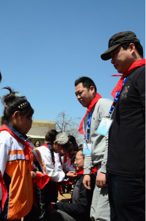 除了唐山斯巴鲁店捐献的桌椅,来自城市的小朋友还将自己的课外读本带来送给苍官营小学的孩子们。大家都对孩子火热的爱心感动不已。苍官营小学的学生代表为爱心车主们系上红领巾,用少先队员最高的荣誉感谢这些满怀爱心的叔叔阿姨们。面对这些瘦弱的孩子,车友们主动蹲下身来,微笑着看孩子们为自己系红领巾,有的车友更是深处温暖的双手为孩子整理衣领,关切地询问孩子的学习情况。