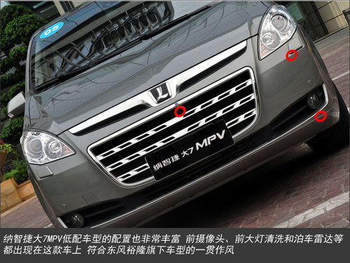 纳智捷大7 MPV的前脸采用家族式的飞翼式水箱护罩,但是面积却要比其他车型更大一些。在外观造型上,纳智捷大7 MPV显然具备纳智捷家族鲜明的“智慧飞翼”特征,精致细长的飞翼式水箱护罩上,展现出与众不同的气度与格局;前卫晶钻头灯更展现出这款车型的大气特征在配置方面,这款车在车头配备了前隐藏式摄像头、前泊车雷达和大灯清洗等众多的越级配置,而这也是东风裕隆一贯的产品策略。
