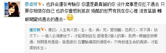 5月23日18点17分,阿娇再次更新微博:“佛曰,人生有八苦:生,老,病,死,爱别离,怨长久,求不得,放不下。一个人必须要放下,才能得到自在。感情是两个人的事,我们一齐曾经快乐过,别问是劫是缘,皆是缘份。在体验痛苦的过程中,只有参透生命的真谛,才能得到永生。”阿娇默认与男友分手。随后阿Sa转发阿娇微博:“也许命运在考验你,你还是最真诚的你,没什么事是你扛不过去,只要你相信你自己,也许你会感到孤寂,残酷的世界有我在你心里,流言蜚语,转眼间变成过去的过去”,。