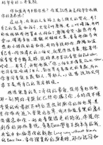 搜狐娱乐讯5月23日香港媒体官方公布一封黄家强写给哥哥黄家驹的信,信中分四个方面给天堂的哥哥黄家驹汇报:一、曾经几次三番希望促成beyond重组,但最后无奈在95年宣布解散;二、跟beyond其他成员并没有不和,叶世荣结婚没请并没伤兄弟和气,跟Paul(黄贯中)也没有闹交(吵架);三、回忆与二哥黄家驹的感情,跟二哥感情最好;四、汇报现在感情状况,太太是日本人,不会说广东话,但很顾家,二人生活很幸福。最后总结“爱的太迟”,称:“人,就是犯贱!往往到了失去才懂得珍惜。读书时期,是Beyond最火红的年代,但读书时期的我,是一名呆呆的学生到真正听Beyond的歌,已经是踏入社会工作,可惜人走了、乐队解散了。没有妄想他们复合,往事也只能回味吧。后知后觉的我,只怪一切爱得太迟。”