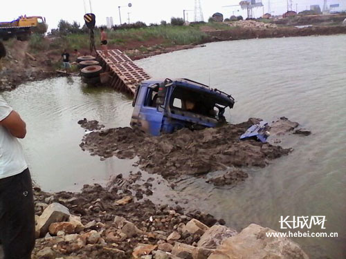 长城网唐山7月15日电(肖曼)近日,在曹妃甸沿海公路上发生了一起车祸,一辆大卡车掉进了虾池,所幸司机被成功救出。