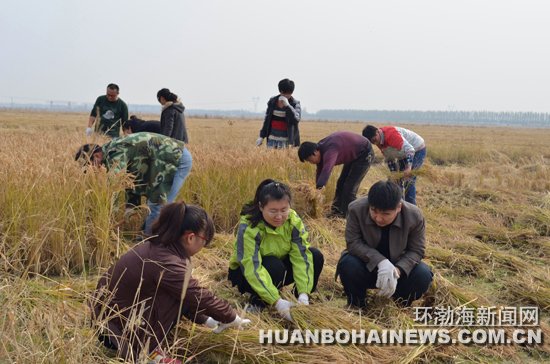 10月31日,位于曹妃甸区八农场尚庄子村境内的该区大学生村官创业示范基地稻田里一片热火朝天,由区大学生村官交流中心组织的“秋收体验”活动正在这里展开。73名大学生村官手持镰刀、弯腰弓背,亲身体验稻田收割,以实际行动积极投入到新农村建设之中,深深体会到了农工耕作的辛苦。