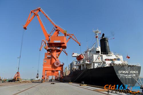 1月20日,首艘抵达曹妃甸港文丰木材码头的外籍货轮“维纳斯号”在卸载木材。新华社发(郝晓维 摄)
