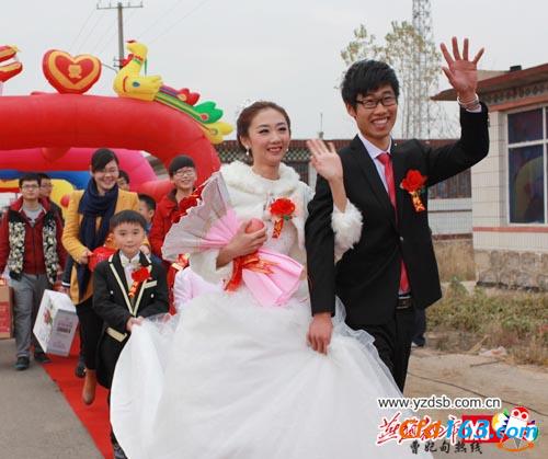 新郎新娘同为柳赞镇村民,相恋于学生时代。新郎李万鹏家经过了一次搬家后,恰巧与新娘家相隔三排居住。因为迎亲距离较近,又恰逢APEC会议期间唐山境内车辆限号通行。新郎新娘决定摒弃“摆谱”、“显阔”的迎亲车队,而是选择更为“环保”的步行迎娶。在现场亲朋好们的簇拥下,两位新人手挽手,踏上红毯,一路欢声笑语,走进了自己的婚房,迈向了自己幸福的港湾。
