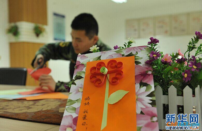 在勤务中队,大学生士兵张俊用五颜六色的彩纸,剪制一朵康乃馨准备送给母亲,他说:“前几天给妈妈打电话时,得知她生病了,我很担心,可是我的岗位需要我坚守在这里,马上母亲节了,我把这个送给妈妈,妈妈我爱你!”