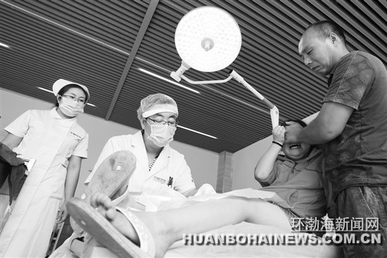 7月22日,北京友谊医院外科专家正在为一名小患者进行微创治疗。当日,北京友谊医院专家团坐诊曹妃甸活动在这区工人医院举行。北京友谊医院选派出由知名专家组成的医疗团队来曹妃甸区工人医院进行业务培训、体检指导、疑难病症咨询等活动,提高曹妃甸地区医护人员的医疗水平,解决患者看病难的问题。