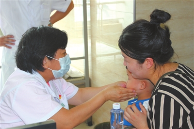 图为友谊医院儿科副主任医师金宗平为患者进行检查。通讯员卢越摄