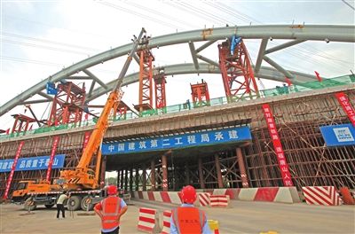 由中建二局土木工程有限公司承建的唐曹铁路南堡跨世纪路特大桥96米简支拱8月31日完成合龙。图为最后一截80厘米长的嵌补段被吊装到作业面。记者 赵勇 摄